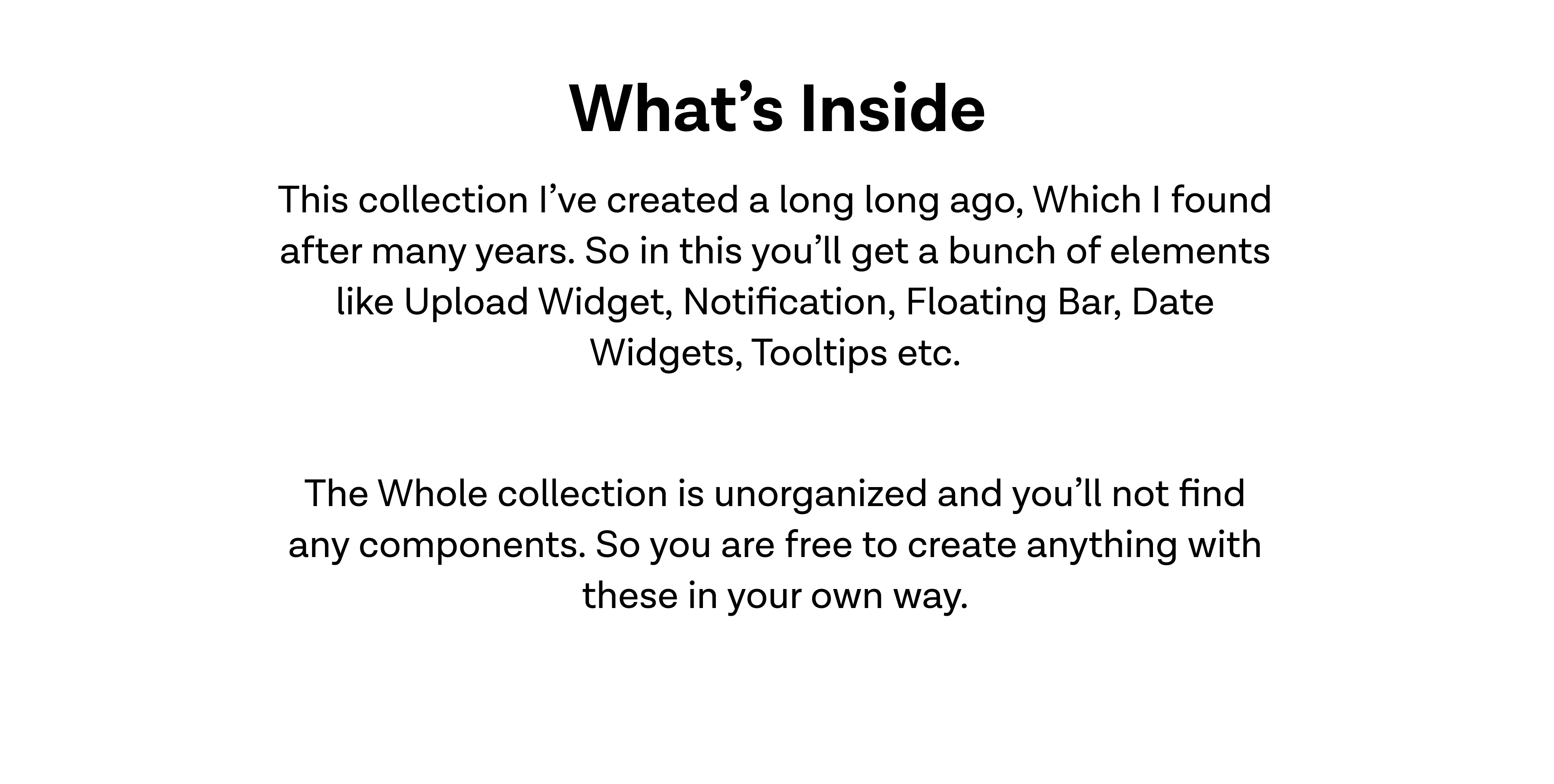 This collection I’ve created a long long ago, Which I found after many years. So in this you’ll get a bunch of elements like Upload Widget, Notification, Floating Bar, Date Widgets, Tooltips etc.